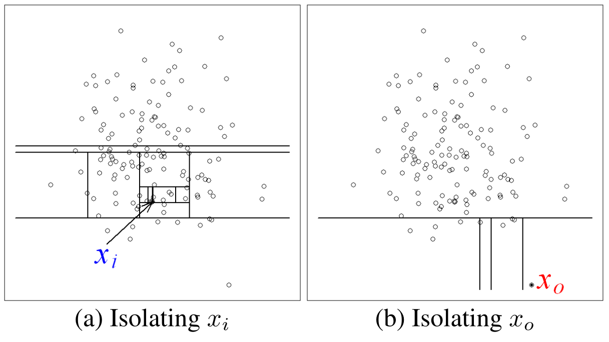 - Compute average path length $h(x)$ for node $x$ from multiple isolation trees.