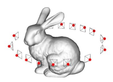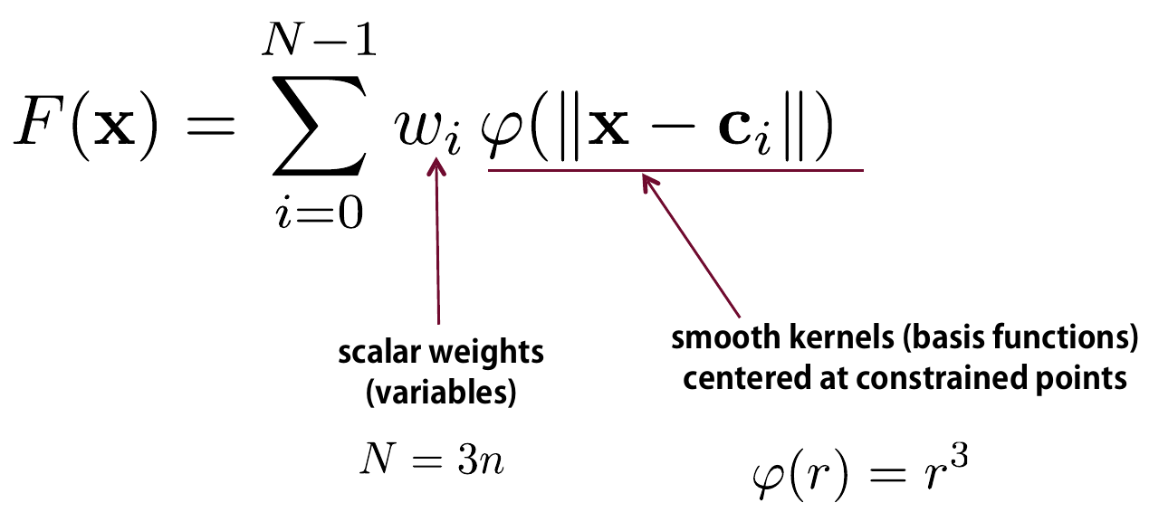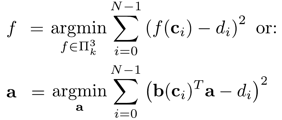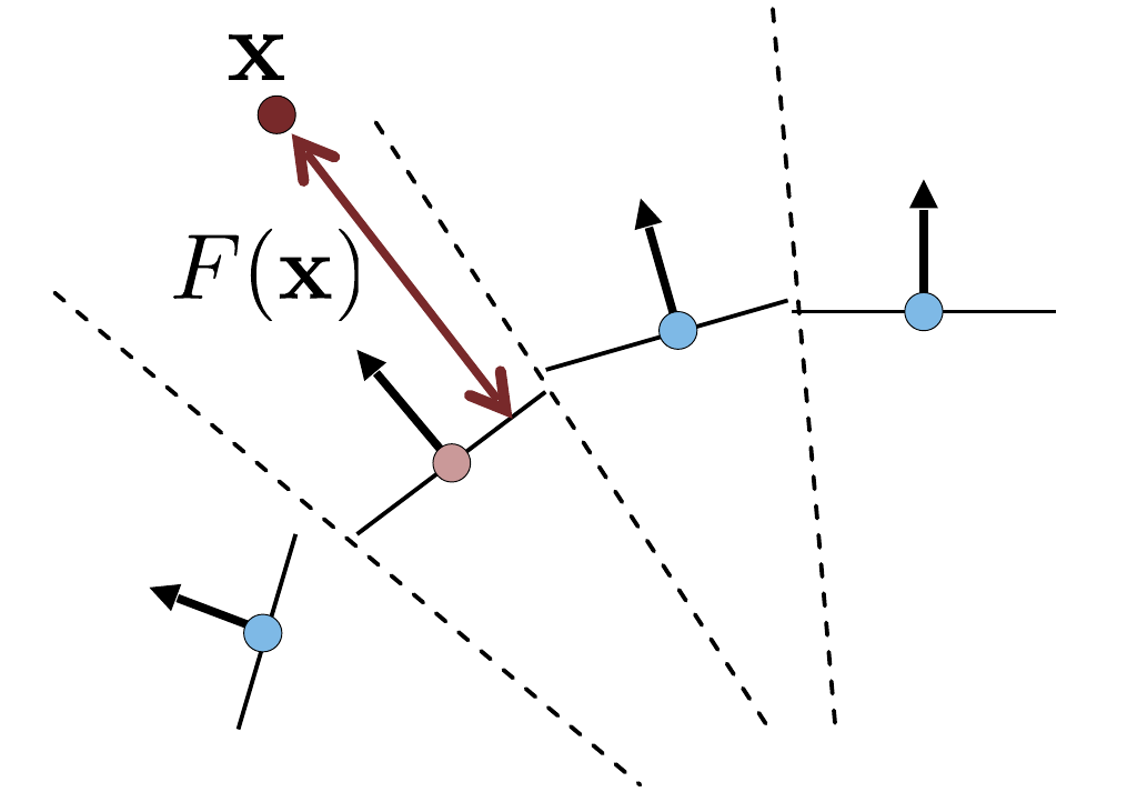 \[ F = \argmin_{f \in \mathcal{F}} \sum_{i=1}^N ||f(\mathbf{x}_i) - \hat{F}_i||^2 \]We want to find function $f$ from the space of acceptable functions $\mathcal{F}$ that minimizes the error between any known distance $\hat{F}_i$ at given points $\{\mathbf{x}_i \in \mathbb{R}^3\}$ and the estimated distance value obtained from $f$.