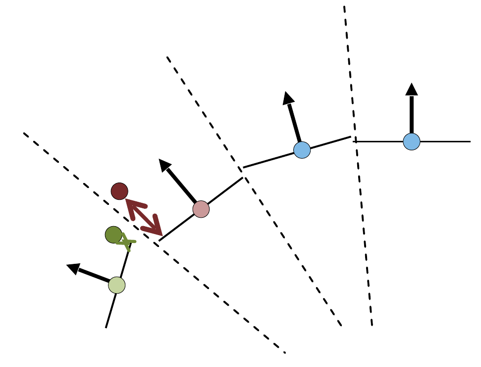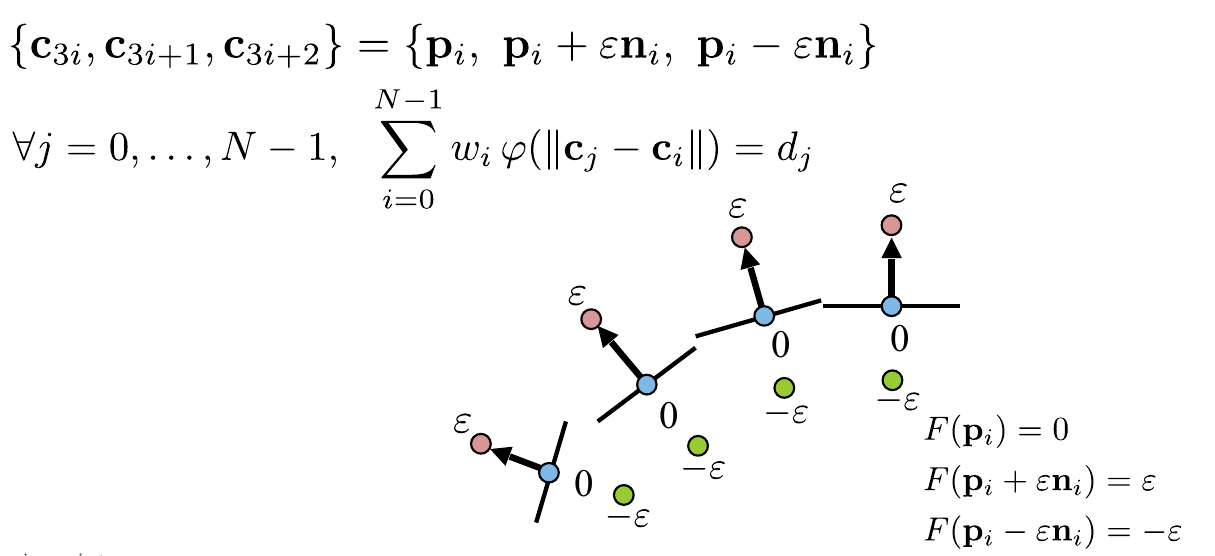 We now add off-surface constraints for each point $\mathbf{p}_i$ by moving the points along their normals $\mathbf{n}_i$ by some $\varepsilon$