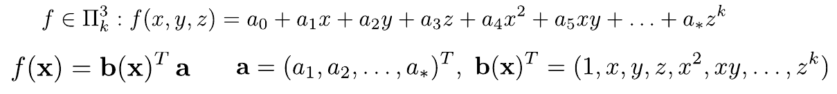In this polynomial, we now need to find the coefficients $\mathbf{a}$, which minimize the sum of squared differences. Here we now use the points in the local vicinity of $\mathbf{x}$.