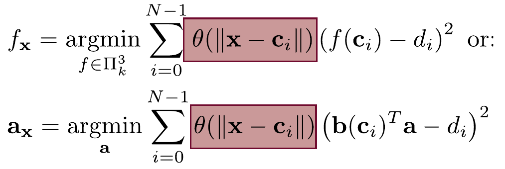 \[ F(\mathbf{x}) = f_{\mathbf{x}}(\mathbf{x}) = b(\mathbf{x})^T \mathbf{a}_\mathbf{x} \]The MLS function $F$ is continuously differentiable if and only if the weight function $\theta$ is continuously differentiable.