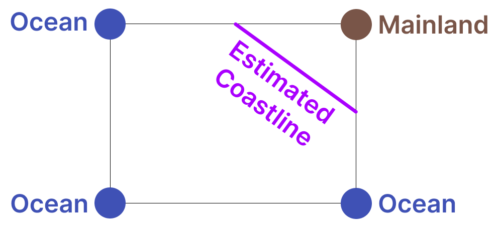 Based on the four sample points, we can estimate how the coastline might pass through the square.