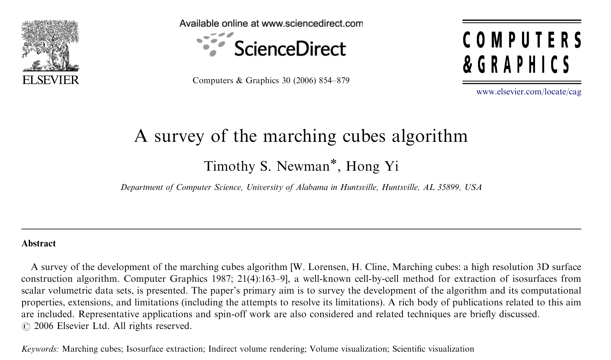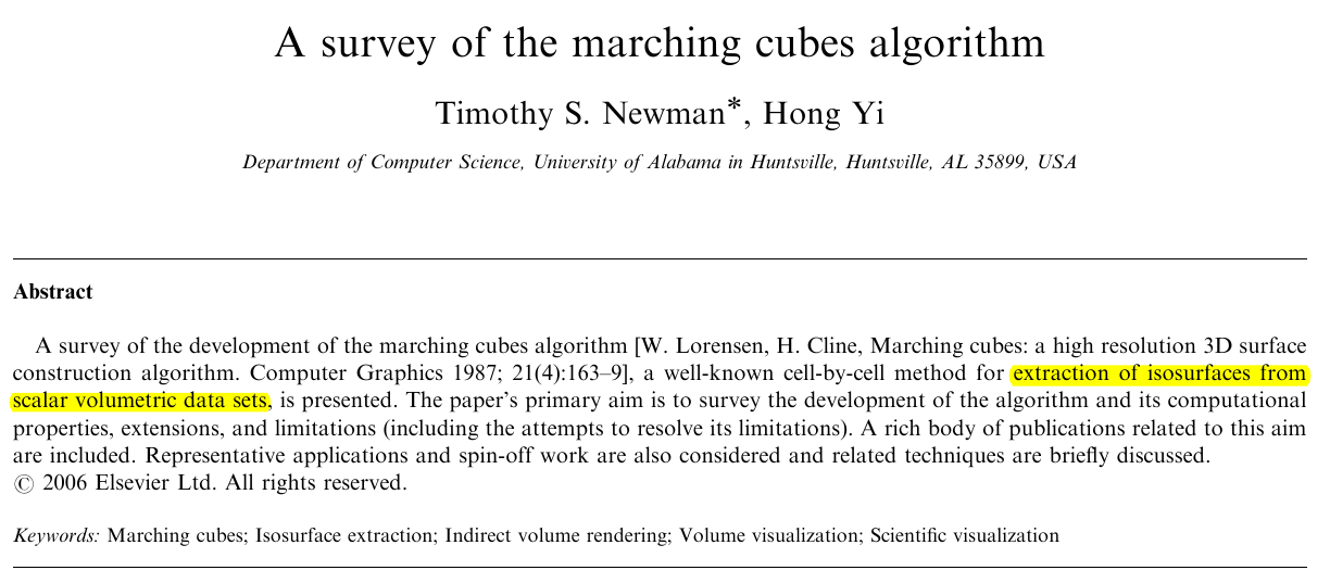 [Timothy S. Newman & Hong Yi, A survey of the marching cubes algorithm. Computers Graphics 2006; 30:854–879.]