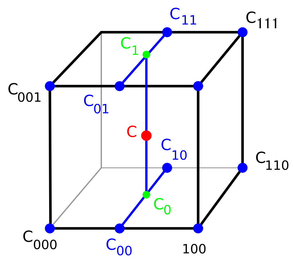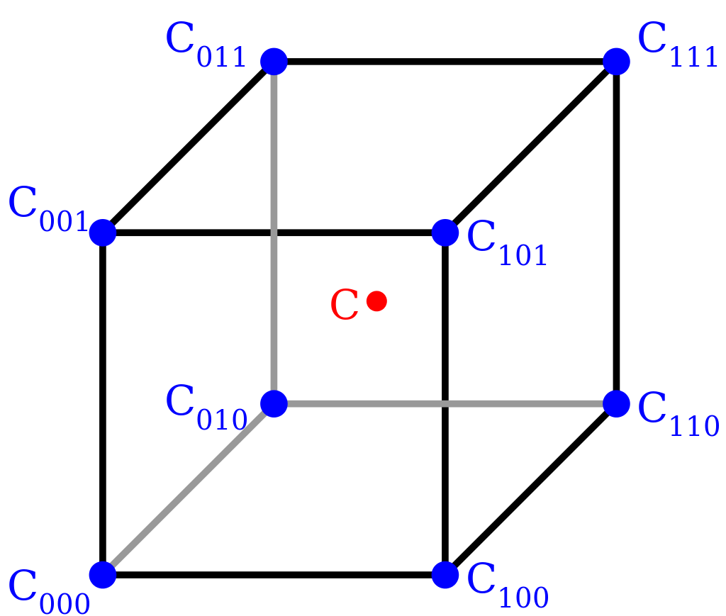 \[ \begin{align*} R_1(x, y) &= Q_{11} \cdot \frac{x_2 - x}{x_2 - x_1} + Q_{21} \cdot \frac{x - x_1}{x_2 - x_1} \\[6pt] R_2(x, y) &= Q_{12} \cdot \frac{x_2 - x}{x_2 - x_1} + Q_{22} \cdot \frac{x - x_1}{x_2 - x_1} \\[6pt] P(x, y) &= R_1 \cdot \frac{y_2 - y}{y_2 - y_1} + R_2 \cdot \frac{y - y_1}{y_2 - y_1} \end{align*} \]All $Q$ values are distance values of the $SDFd$