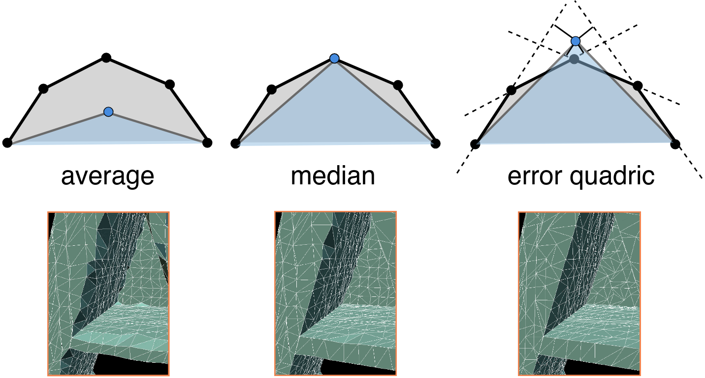 \[ E(x) = \sum_{t_i} \mathrm{dist}(p, q_i)^2 = \sum_{t_i} p^T Q_i p = p^T \left( \sum_{t_i} Q_i \right) p \;=:\; p^T Q p \]The optimal point \(p\) that minimizes the error is computed as the solution of the least-squares system:
